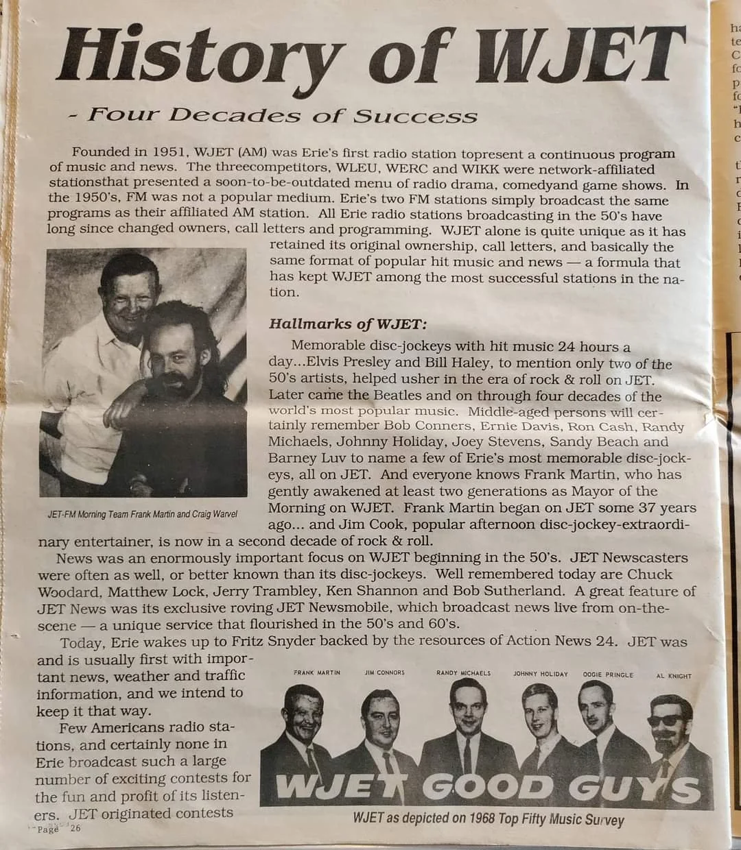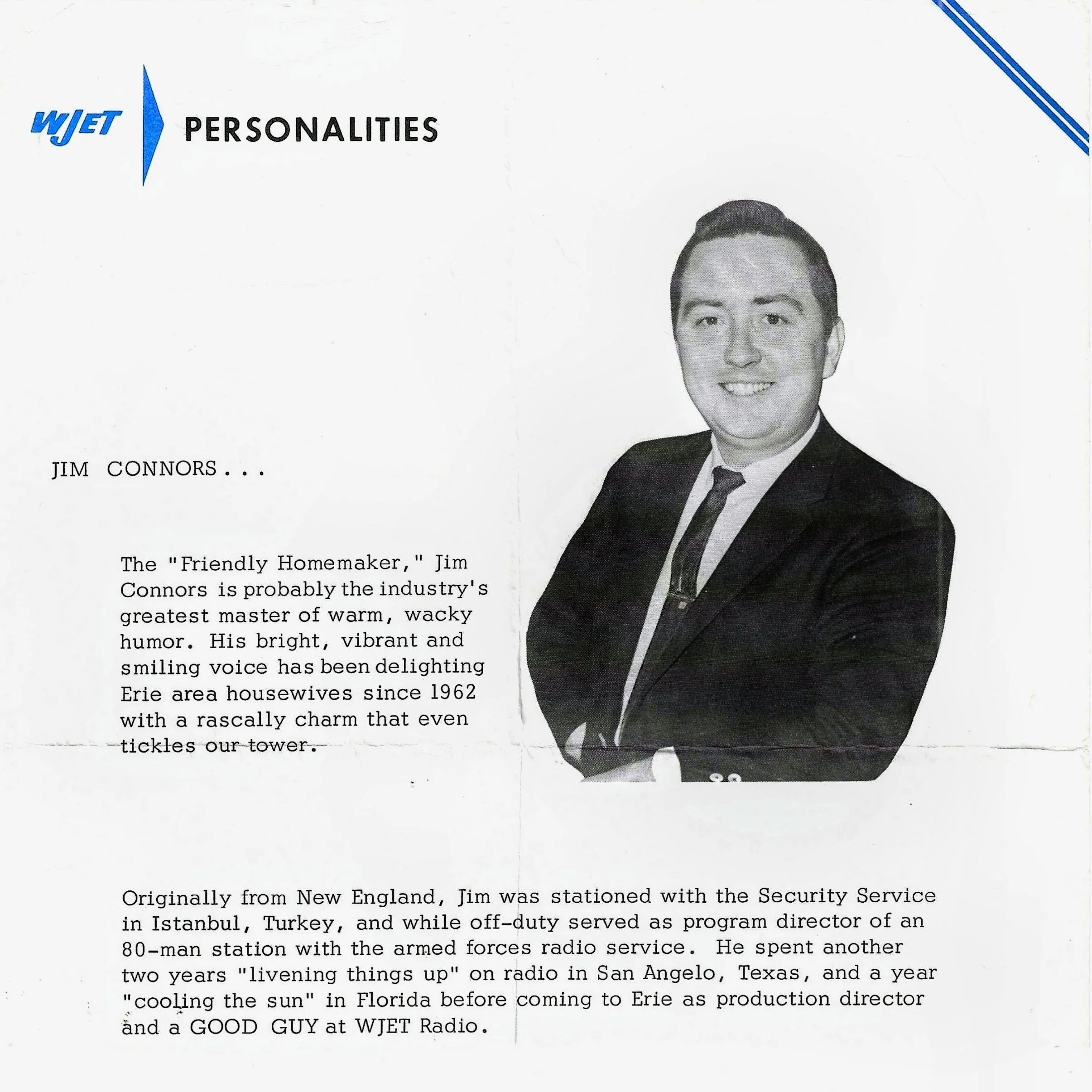 When JC was ready, he turned to Erie, Pennsylvania, and WJET. At that time, WJET was still young but already gaining momentum. Founded by Myron Jones, who had personally built and wired the studios, the station had gone on air in 1957 as a 250 watt daytimer on 1570 AM before moving to 1400 AM. Even with modest power, WJET quickly became Erie’s most talked about station, driven by youthful energy and a hunger to do more than the competition.