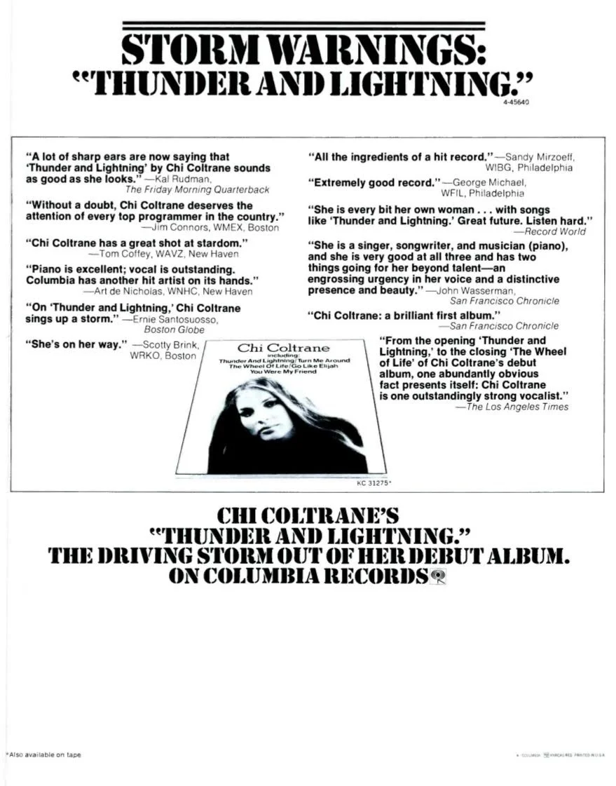 14. Cash Box. (1972, July 15). Without a doubt, Chi Coltrane deserves the attention of every top programmer in the country. *Cash Box*. Retrieved from https://worldradiohistory.com/Archive-All-Music/Cash-Box/70s/1972/Cash-Box-1972-07-15.pdf