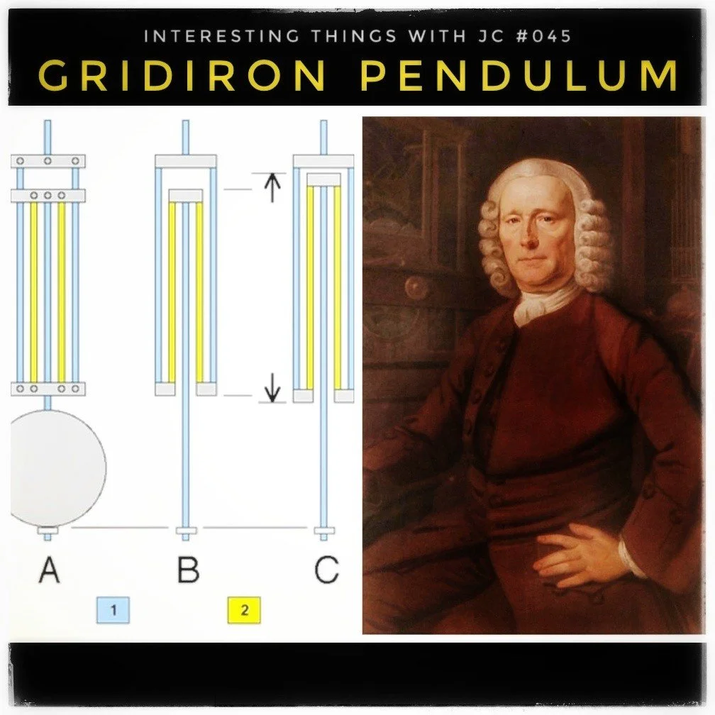 Interesting Things with JC #045: "Gridiron Pendulum" - An innovative clock pendulum invented by John Harrison and improved by John Ellicott in the early 18th century. This clever design used different metals to maintain a constant pendulum length despite temperature changes, revolutionizing timekeeping in an era when precision was paramount.